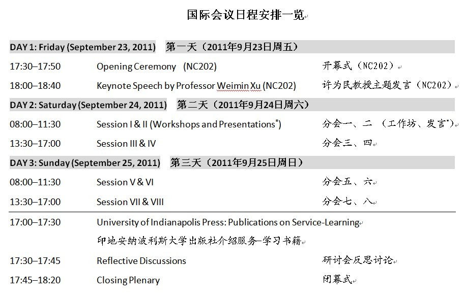 第四届“国际视野下的高等教育服务-学习”国际研讨会将于2011年9月23日下午5:30在学院NC202开幕。此次研讨会由公司和美国印第安纳波利斯大学联合举办,是公司十周年校庆的重要活动之一。在即将到来的的两天会期中,来自美国、南非,台湾、香港以及国内多所高校的服务-学习专家、学者与公司参会代表共同发言和交流。研讨会涉猎的内容丰富、领域广泛,例如,美国印第安纳波利斯大学的物理治疗专业师生,远赴非洲坦桑尼亚开展服务当地的社区活动,香港岭南大学服务研习团队,在云南某偏远村庄开展“云南农村发展工程”合作项目等等,都体现了服务-学习在各种社会领域中的实际运用,服务-学习模式已经在世界许多高校逐步展开,其内涵和影响值得中国的高校借鉴和研究。